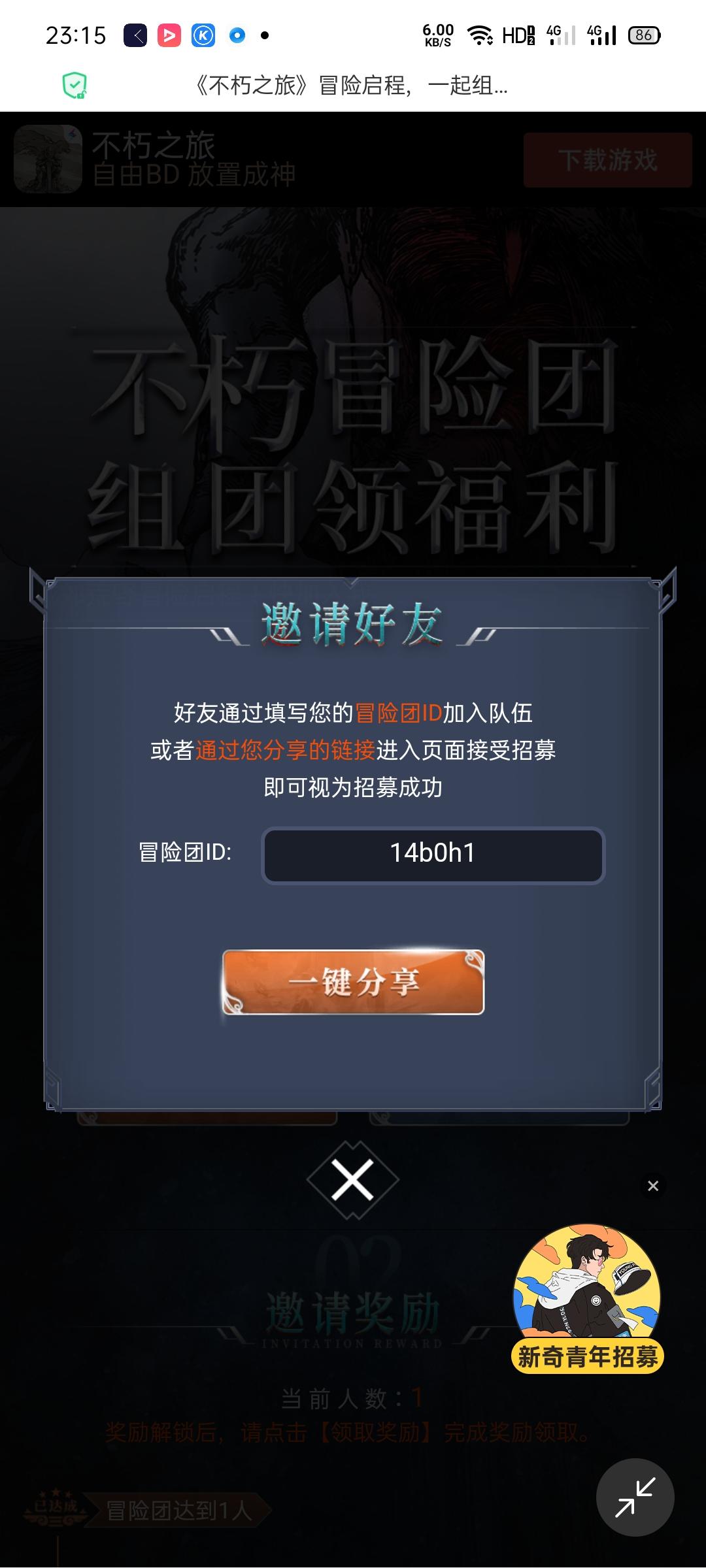 二区组团了城郊荒野冒险启程!快加入我们冒险团,一起共享成团福利吧: https://activity.leiting.com/bxzl/202010/invite/?id=14ahh3