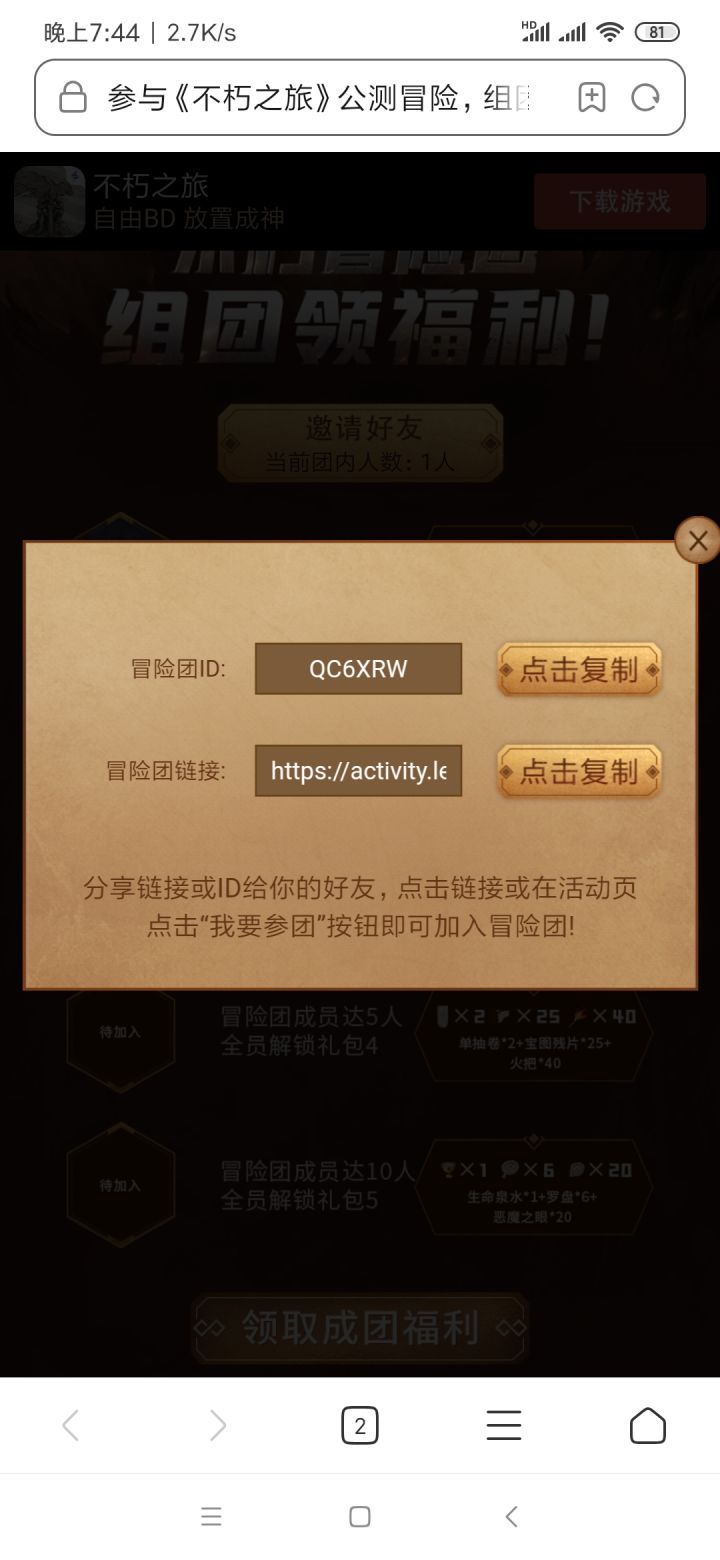 加入我们冒险团,一起共享成团福利吧:https://activity.leiting.com/bxzl/202009/invite/?code=M6MXXBM6MXXB还差1个人。就能拿全奖励。大家速加