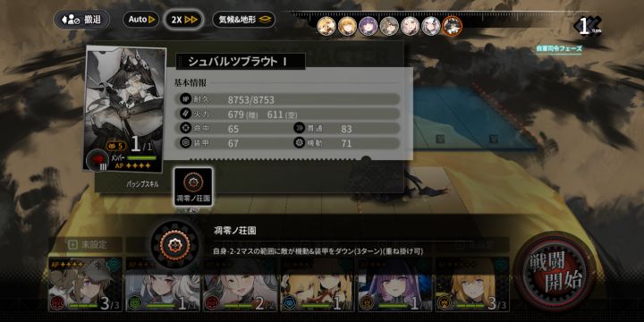 更新体力,侦查情报。战斗说明目前胜利条件好像只有全歼敌人。我方全灭,或者地,空任意被敌方推到底线会败北。AP,CP:行动点数,技能点数,根据角色每回合恢复。模式切换:飞行有高空和低空模式,高空貌似闪避会高一点。待验证。地面有移动和固守模式,固守时不能移动。切换模式要一点AP,不同模式时技能也有区别。地形,气候:会影响移动需要的AP,属性。点上方的气候&地形可以查看。行动条:右上角显示