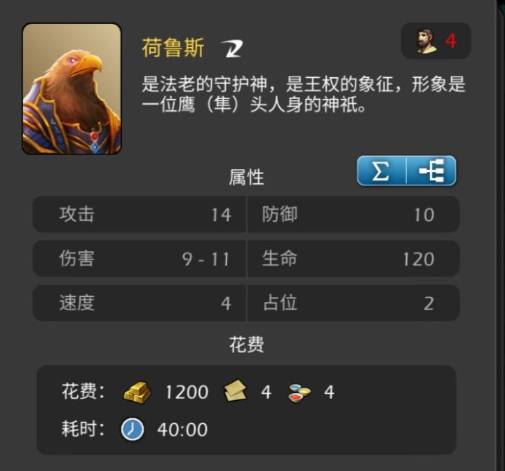首先看各文明常用兵种造价:埃及狗头造价1100金,埃及荷鲁斯造价1300金,中国女娲造价1100金,波斯铁骑造价1800金,波斯轻骑,影子造价1000金然后看属性方面狗头和重骑,女娲属性相当,狗头少了2最高伤害,狗头60血,重骑只有40,女娲有80血,荷鲁斯属性高出他们一大截,血量120,还具有反击,轻骑影子不但各项属性大幅降低,血量更是只有30和22再看实战数据:1.一组荷鲁斯+1灰对