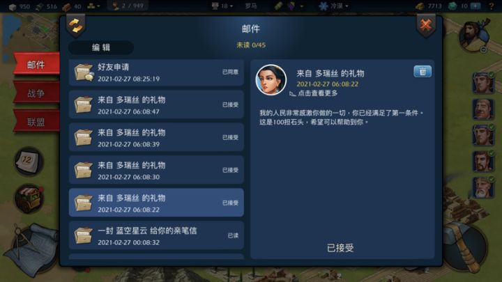 我今天完成了希腊17章任务NPC送了我400个石头(多瑞丝的邮件4个400个石头)之后令人脑溢血的事情来了,我朋友想送我200铜做任务,结果我物资接收上限了!血压一下子上来了!