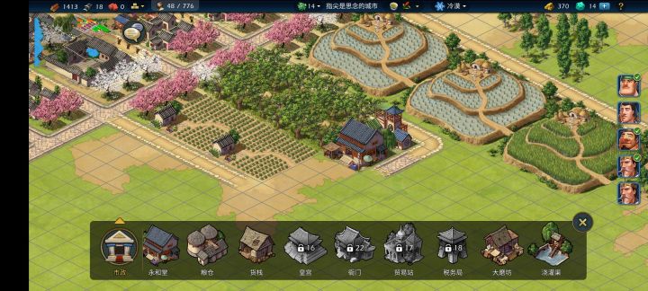 我玩的帝国选的中国,现在进程到了中下阶段,希望可以增加美化建筑里的种类,例如绿化用的杏树、柳树、梅树、花丛,军营用的木质栅栏、拒马、哨塔,希望后期能加入这些植物和建筑。