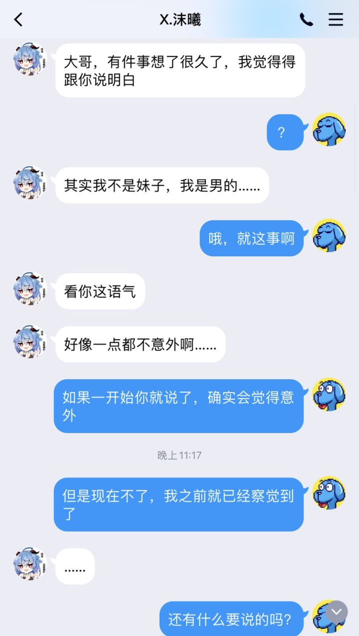 好家伙,略施小计果然还是奏效了。一个30岁大叔,没什么钱也没什么本事,为了不当舔狗、享受被舔的快乐,冒充花季少女各种跟妹子套近乎,玩弄纯情男生们的感情。无奈演技太差终被识破,又不敢当众承认自己的所作所为。世道安能如此,可叹,可叹啊。附上聊天记录证明我不是随便乱说的。