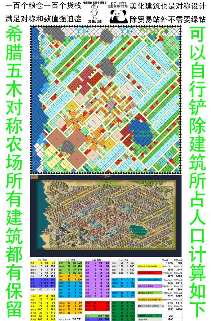 希腊五木对称农场布局图自己在用的布局图,已经满级没有bug,附带全景图预览和人口数据统计。满足任务模式升级所需所有建筑不浪费,也可以开自由模式满足各种强迫症和收集控。希望能够多一种不一样的布局,我也在继续做其他布局,有任何建议请联系本人YF,QQ见图片