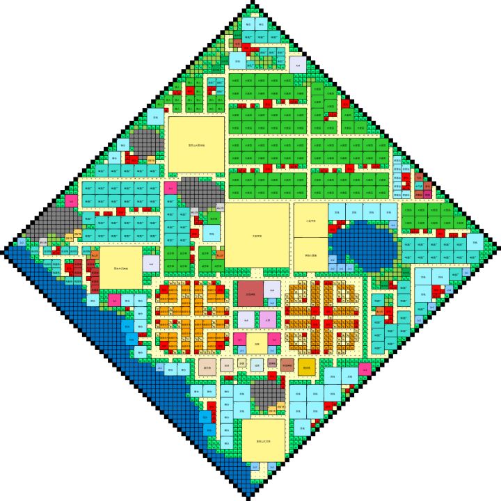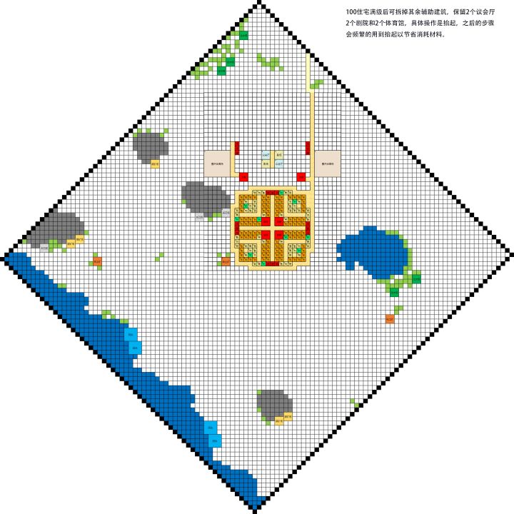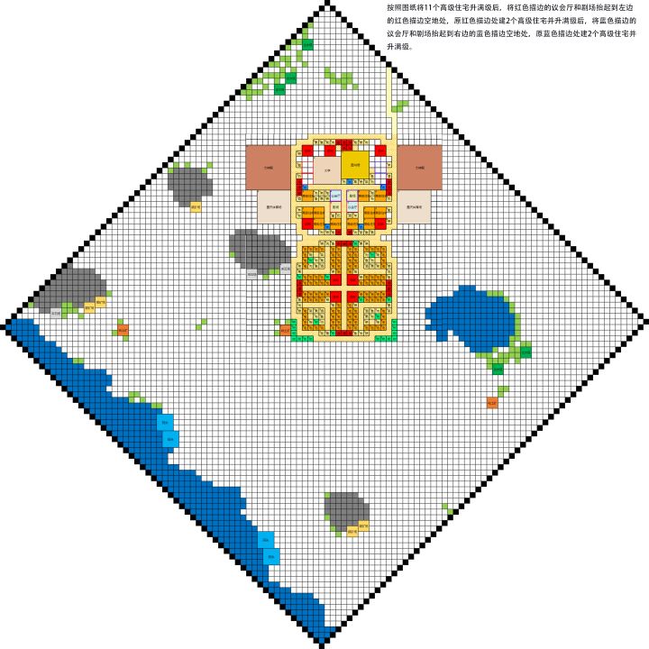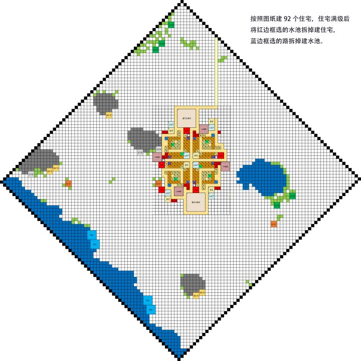 忘了是去年还是前年做的了,当时实在找不到合适的能从开头用到结尾不需要改布局图,自己做了一个。玩那个一级一级的模式可以直接用,不过我记得在前期的时候,好像是有点人手不太够,需要拆一些建筑,完成任务升级。如果这游戏这两年没有加一些什么新的建筑的或者有什么更改的话,这个图肯定是能能用的。我当时做好这张图之后,从一级开始玩到全建满,在这期间也改了很多次,这是建完之后的最后成品图。这几年没再玩啦,今