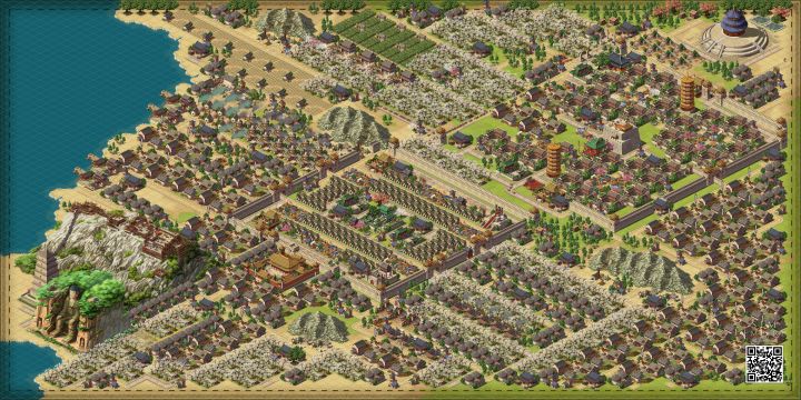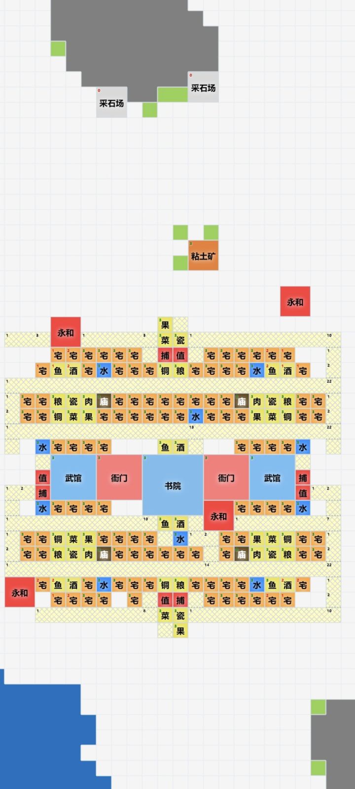 看了下论坛里的华夏普通住宅规划好像都没有达到极限,就自己设计了一个,4庙4捕值宅子数量是超过100的,还可以空出来几个位置永和覆盖书院要放中间影响了对称没有断路,衙门忘了加路