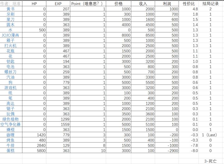 一时兴起肝了一份礼物数据集合出来,希望对大家肝结局有所帮助Ps1:性价比是指 利润÷exp 的值,表示每一点EXP能转换的钱数Ps2:截图的时候发现有个意义不明的“Point”值,送越贵的食物加的越多(最高是蛋糕+10),不是食物的话都+1,不知道涉及到什么Ps3:最右边是我试图每种东西都送一次的失败尝试,还没送完exp槽就满了,看来想要送齐所有礼物是不可能的