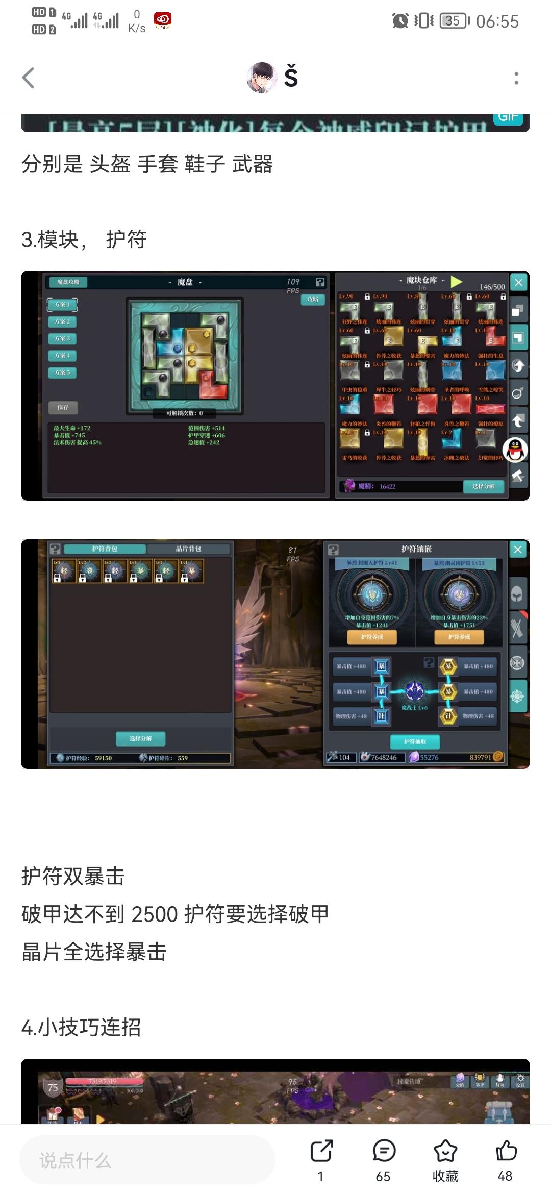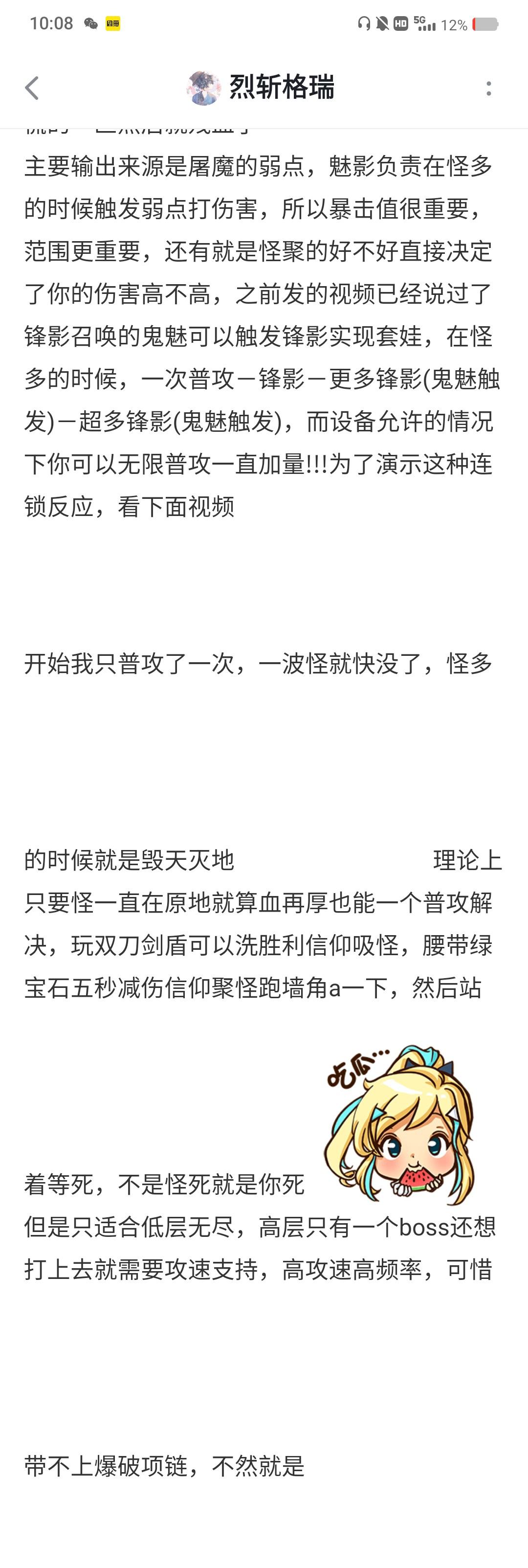 侧边栏想点录屏的结果给我干到小游戏里了,慌的一匹然后就残血了主要输出来源是屠魔的弱点,魅影负责在怪多的时候触发弱点打伤害,所以暴击值很重要,范围更重要,还有就是怪聚的好不好直接决定了你的伤害高不高,之前发的视频已经说过了锋影召唤的鬼魅可以触发锋影实现套娃,在怪多的时候,一次普攻-锋影-更多锋影(鬼魅触发)-超多锋影(鬼魅触发),而设备允许的情况下你可以无限普攻一直加量!!!为了演示这种连锁反应,