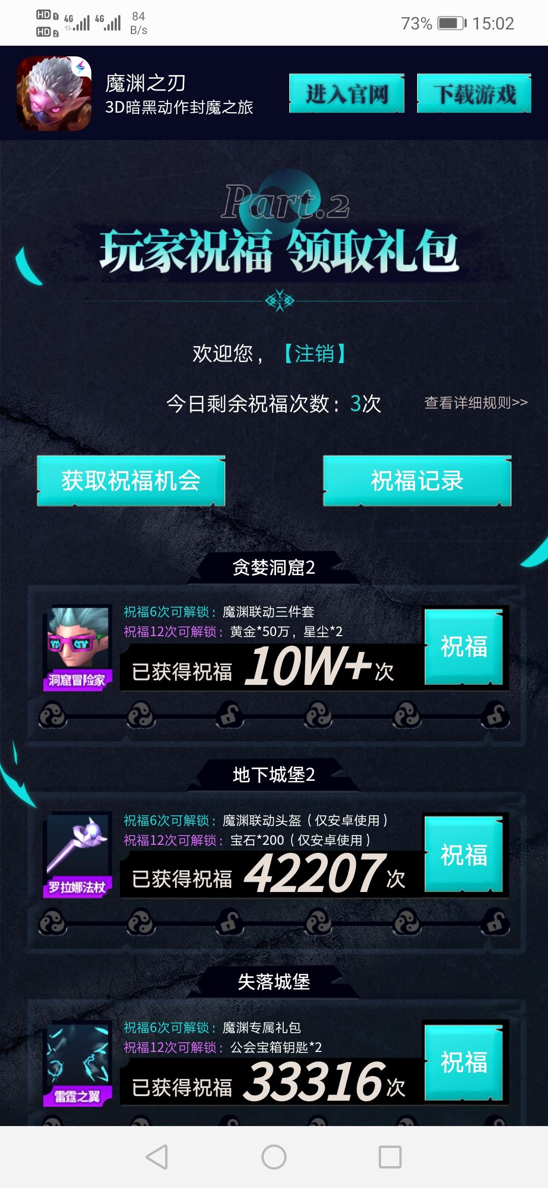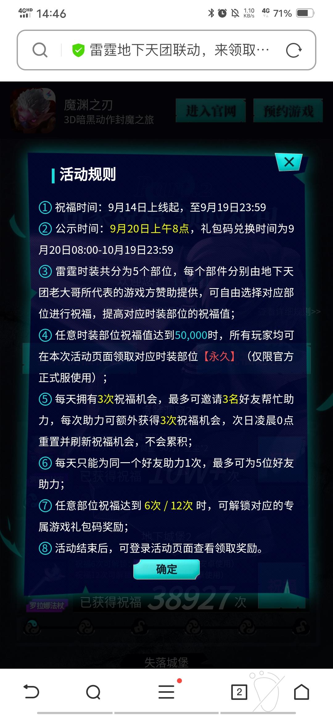 帮我助力,一起来拿地下天团合体时装吧!http://activity.leiting.com/myzr/202009/h5/?id=2e3a7de104f1f913f8dfced0601c0d60祝福点没到5w的,魔渊能获得的只有时装,其余的都是各游戏的,所以超过5w的点过就不要点了