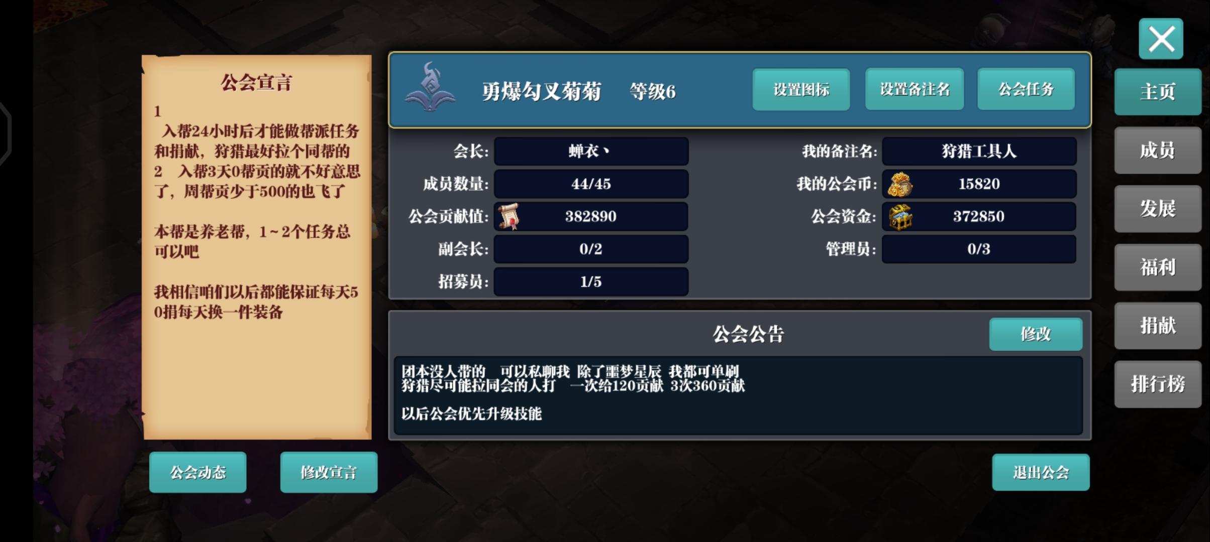 公会公告6月27日版 目前公会排80来名,所以狩猎随意,任务随意。 但是 晚上8点前必须金币捐献一次,10点清尸。 不论做了多少贡献 其他人 早早的签到捐献了 ,结果拿不到50捐的礼包,你每天晚上11点上线拿50捐礼包,什么意思? 目前公会商店6级 公会技能5级 ,养老帮,但是不收尸,欢迎长寿的人加入。 只要每天金币捐一次就不会被踢,不看贡献
