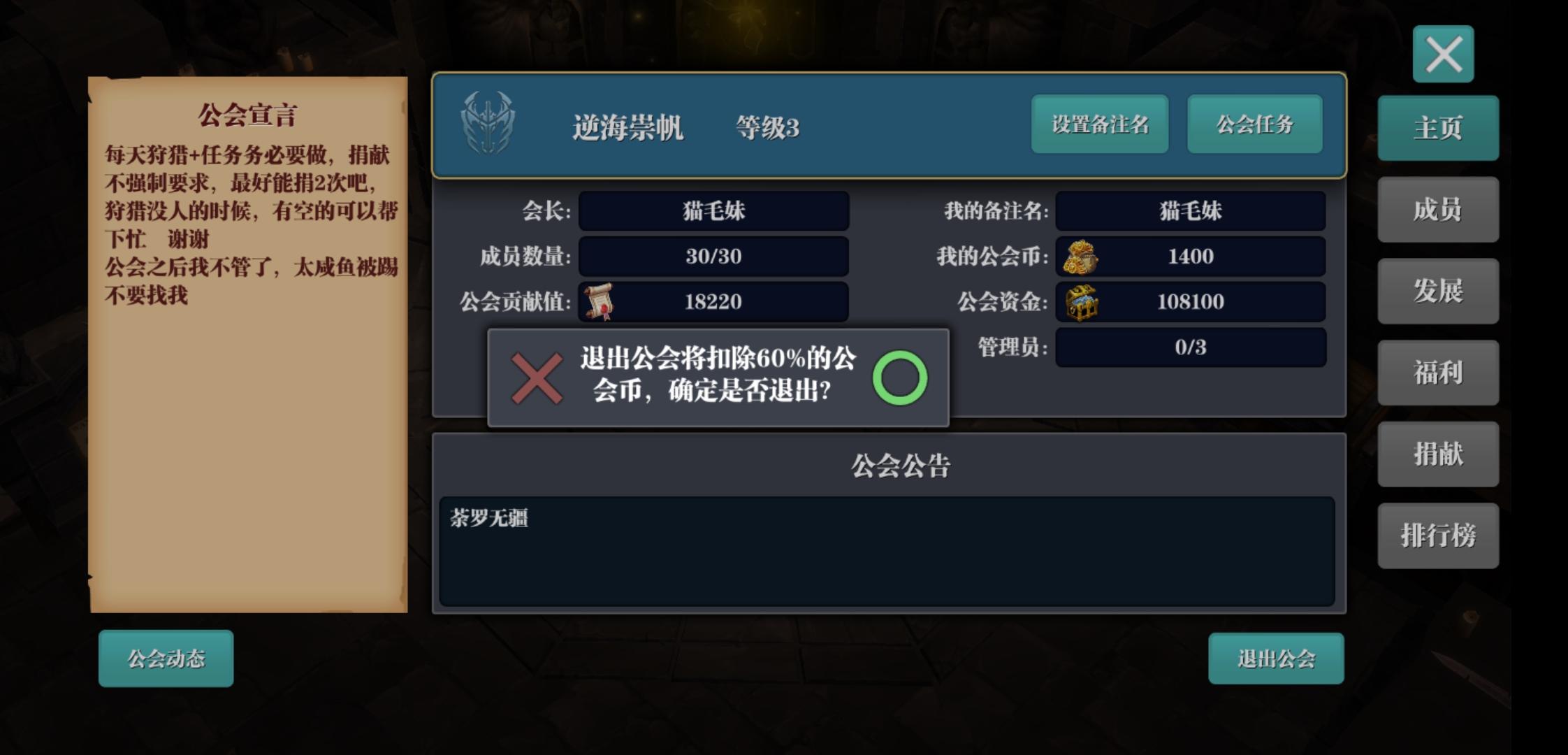自己创了一个公会,天天满捐献,没想到50次捐献都拿不到,脑瓜疼,已经跑路