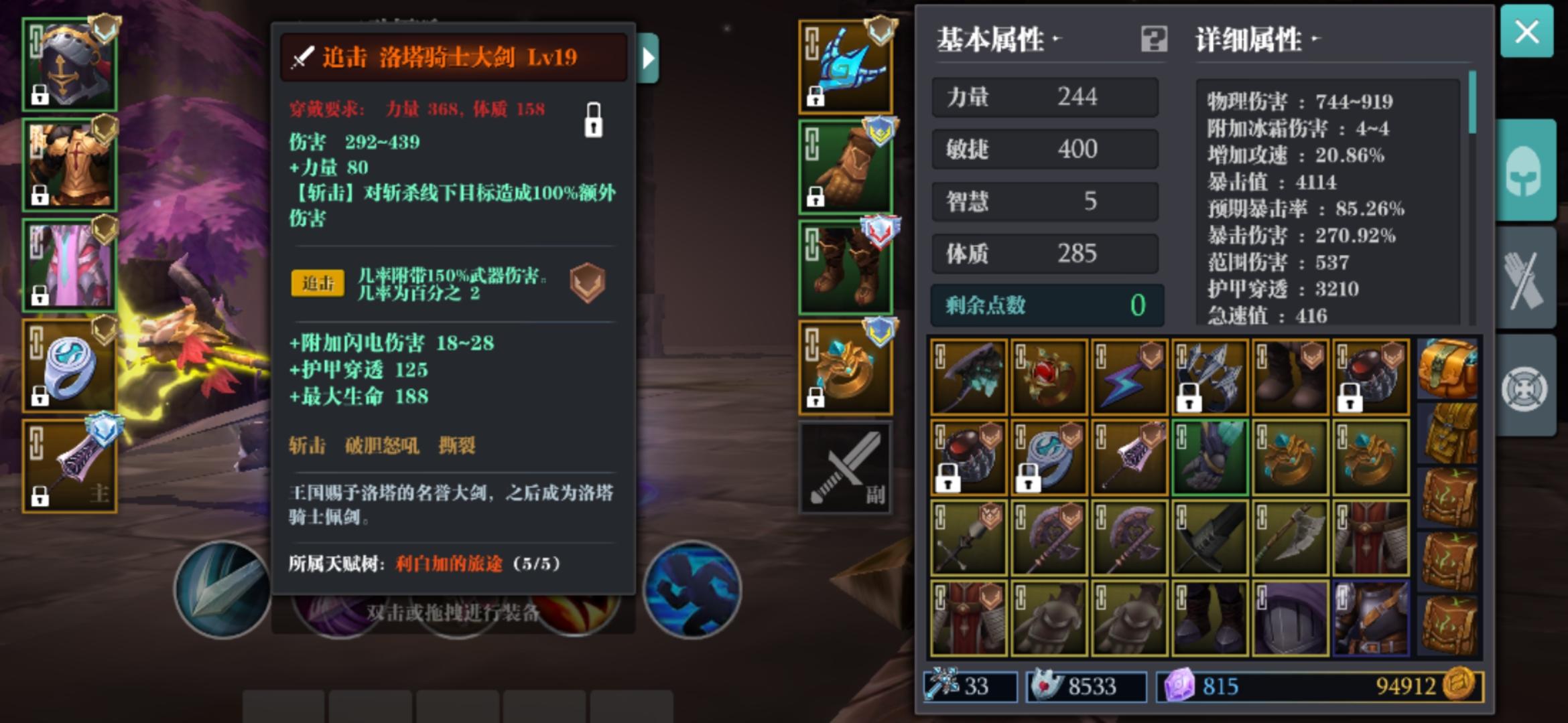 太容易暴毙了(血量提到4000+不知道好不好生存)。五件套没弄,也不想弄浪费我的材,白嫖党没时间刷刷材料。双36强化配蛮王斧与翼飞。伤害差不了多少(血量越低伤害越高)生存翼飞强点。