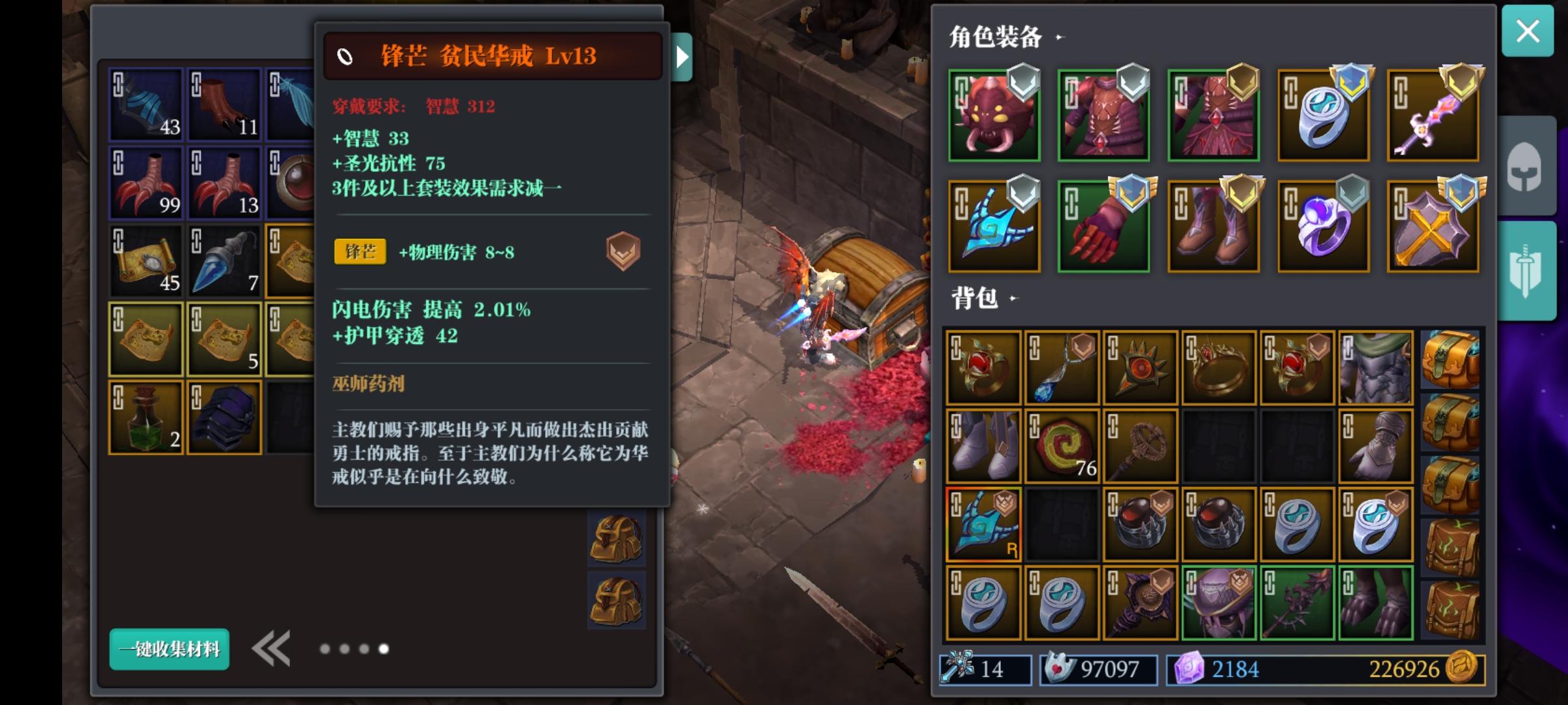 今天掉了俩绿色武器 突发奇想试了试 俩蚁王加聚能头 腰带随便凑了个玄武 反击加离殇 小夜曲~~打起来莫名带感 尽管刮痧 不知道洗炼洗炼 下周能强化到41的话 可以继承激活双36 再做一个蚁王腰带 不知道有搞头没 感觉盘子用致命一击加战术大师