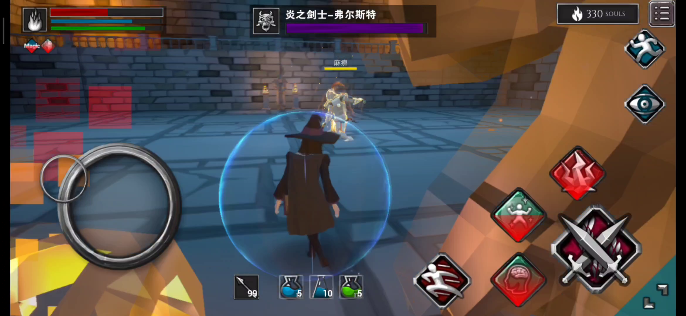 我玩的是双剑士,玩到第一个大厅的第三关的时候,我把那个拿刀的剑士砍成一丝血了之后,与那个拿斧的周旋了一会儿,本想上前想去把那个脆皮先给干掉,结果发现攻击不了剑士,硬生生的的连续三把被那个拿刀的脆皮给砍死了,就是按那个攻击键的时候,他没动作,然后就被砍死了!