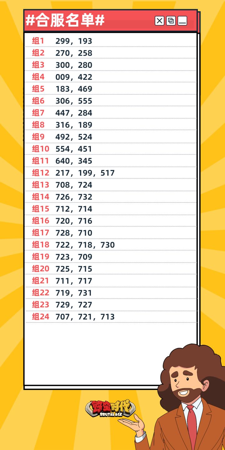 【合服预告 | 最新一期合服公告已出!】亲爱的首领大人,我们将在近期对以下服务器进行合服。本次合服将以“备战合服”活动决定每一组被保留的服务器。“备战合服”活动开启时间及合服时间将于近日公布,敬请关注游戏内邮件及官方社区消息。感谢您的理解与支持,祝您游戏愉快。