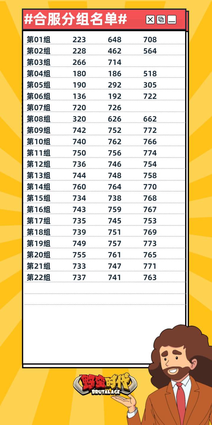 【合服公告 | 本次合服分组名单已出】亲爱的首领大人,基于开服时间、活跃人数和综合战力等因素的考虑,我们得出了本次合服的如下图所示分组名单;合服备战活动将在本周二(2022.11.22)开启,请合服的首领注意时间参与。感谢您的理解与支持,祝您游戏愉快!