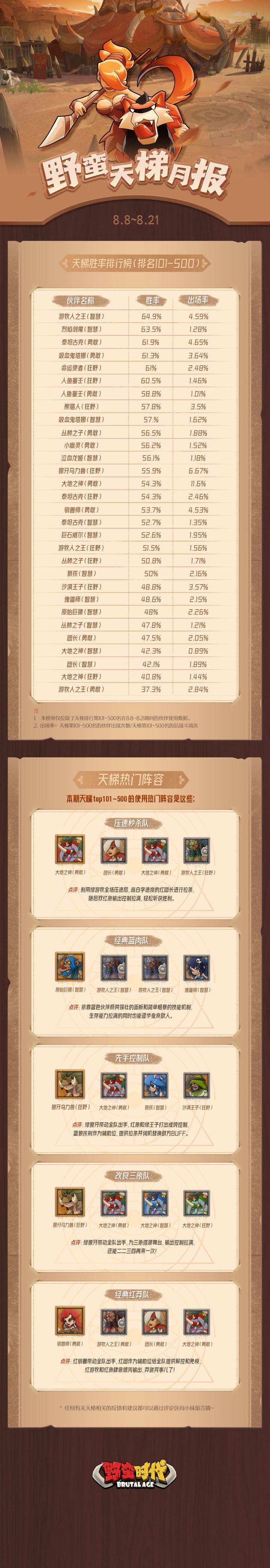 更是拜托运营大大们为首领大人们计算出了天梯排行榜101~500名阶段的天梯胜率排行榜以及他们使用的热门阵容!🤩