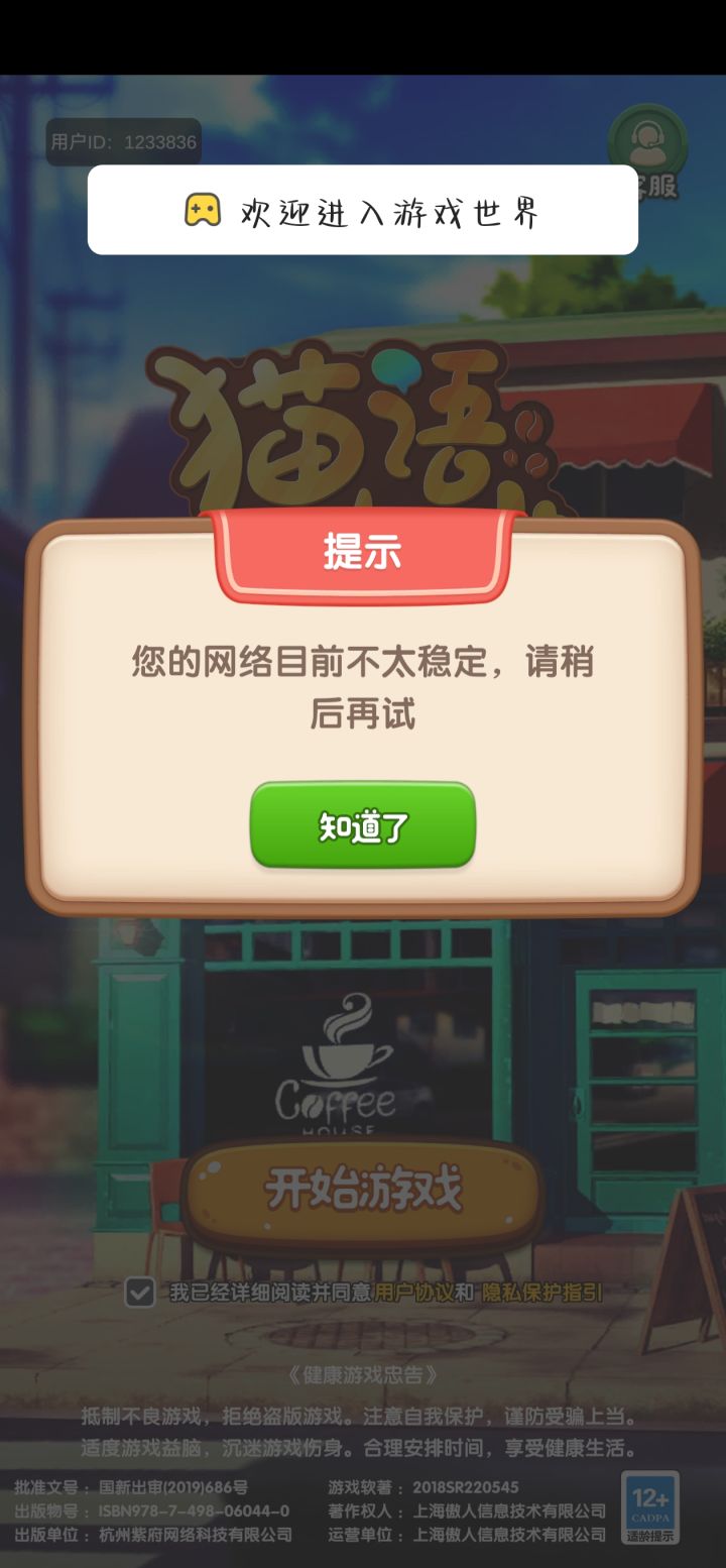 说网络连接不稳定,疯狂登陆都登不上,但是别的游戏就一直没问题,而且在苹果应用商店也搜不到猫语咖啡了,是下架不能玩了吗
