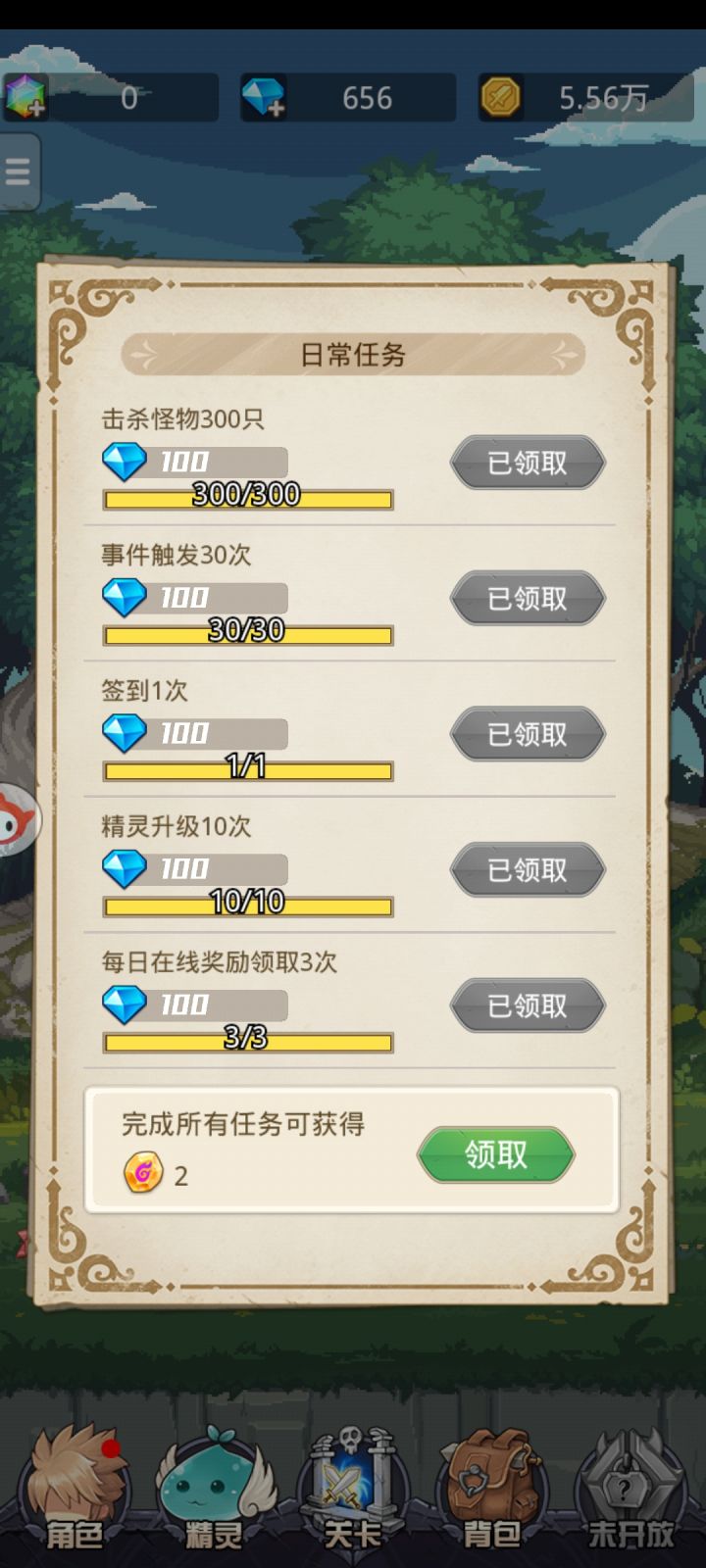 小小勇者,最好每天把日常任务做完,把钻石领完,最好还有额外全部完成奖励。还有每日援助的钻石也要领,毕竟积少成多。随机事件3个前30次都是1分钟刷新,如果游戏时间少的话,建议每日至少把前三十次的随机事件领完,后面五分钟一次的按自己的能力领。