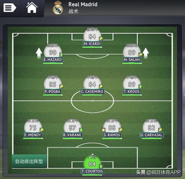 近日,关于西甲豪门皇家马德里俱乐部的转会传闻受到球迷们的密切关注,有报道称,皇马今夏已经豪掷了3.03亿欧元用于引援。有球迷用正版足球经理手游《梦幻足球世界》做了个皇马新赛季阵容的预测,一起来看下。阵型:4-3-3前锋:阿扎尔、伊卡尔迪、萨拉赫中场:博格巴、卡塞米罗、克罗斯后卫:门迪、瓦拉内、拉莫斯、卡瓦哈尔门将:库尔图瓦足球经理还预测:伊卡尔迪的转会费为9800万镑,阿扎尔为1.1亿