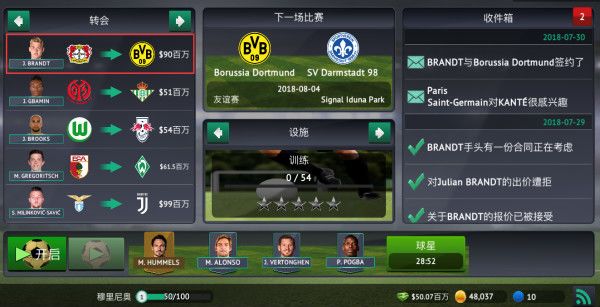 小编最近体验了一款叫做《梦幻足球世界》的足球经理手游,这款游戏给小编最大的感受就是数据真实且数据库庞大,从梅西C罗内马尔,到地区球队的青年队球员,数据全部真实准确,令小编大感佩服。但这一点并不是最让我震惊的,最让人震惊的是这款游戏的转会AI。小编是拜仁球迷,自然开档选择拜仁慕尼黑,开档后没多久,看到老对手多特蒙德收购勒沃库森队的德国边锋布兰特的消息,到目前为止当然一切正常,接下来发生了不可思议的