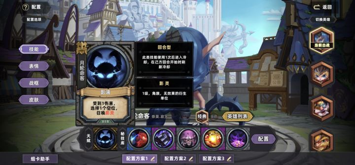 欢迎各位点进来了解、交流,这次想写的是:另类召唤流刺客~月轮刺客各位先看下技能,受1伤召唤一个1费影灵,决定了其站场、多联实力非常强,甚至关键时堵对方关键位置,一举将大局逆转!月轮刺客常用卡组已在上显示,集弃牌、直伤、召唤站场、拿牌、堵位置于一体,几乎无缺点。适合打三回合内结束快攻对战。若未选到铁拳拖至后期5回合后几乎没有反制措施。技能替代可选古代枪(直伤)、波动(站场爆发)在赛季50星以