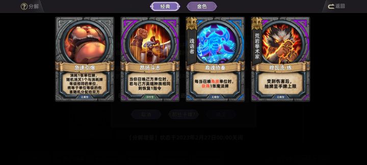怎么说呢,被货币劝退了。我没想过一个手游里面有这么多种货币,金币、保底的、充值的、抽卡的、赛季卡池的,七八种之多,又甚至打那个试炼(大概是竞技场?)刷新初始技能也需要花某种晶石,我都不知道这玩意是竞技场内获取的还是个人物品里的所以没敢用,像保底和刷新这种咱们直接按次数算,抽卡直接上金币。纯粹点不好吗?游戏性方面,我有点疑惑的就是,初始就满费用后手要那一费有啥意义。要知道先手可是直接多三张牌,这