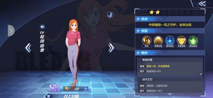 感谢玩家三酱的投稿,本期【角色讲座】给大家介绍的角色是“井上织姬”。在动画里,井上织姬作为BLEACH的女主(我不服 我是一露党!),同时也拥有傲人的身材,还是有许多观众喜欢的,具体的就听小编来详细讲解她的技能吧。角色:井上织姬品质:SR定位:中排辅助伤害类型:鬼道特点:究极治疗【能力评价】输出能力:★☆生存能力:★★★控制能力:☆辅助能力:★★★★★角色获取难度:★【技能