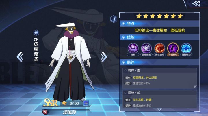 本期【角色讲座】给大家介绍的角色是“涅茧利”,护廷十三队十二番队队长、第二代技术开发局局长,有“疯狂科学家”的典型心理状况,在任技术开发局局长期内对尸魂界有重大的贡献。总是戴着面具,私下摘下面具后真实的样子却是十分的帅气。角色:涅茧利品质:SSR定位:后排输出伤害类型:鬼道特点:毒效爆发,降低暴抗【能力评价】输出能力:★★★★☆生存能力:★★☆控制能力:☆辅助能力:★★获取难