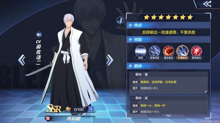 本期【角色讲座】给大家介绍的角色是“市丸银”。在游戏中,市丸银继承了他超远的攻击距离和破坏力,是相当强的物理射手。角色:市丸银品质:SSR定位:后排物理输出伤害类型:物理特点:攻速递增,千里杀敌【能力评价】输出能力:★★★★★生存能力:★★控制能力:☆辅助能力:☆角色获取难度:★★★★☆【技能介绍】普通攻击:对敌方单体造成少量物理伤害普通技能<无踏连刃>:对敌方单体造成