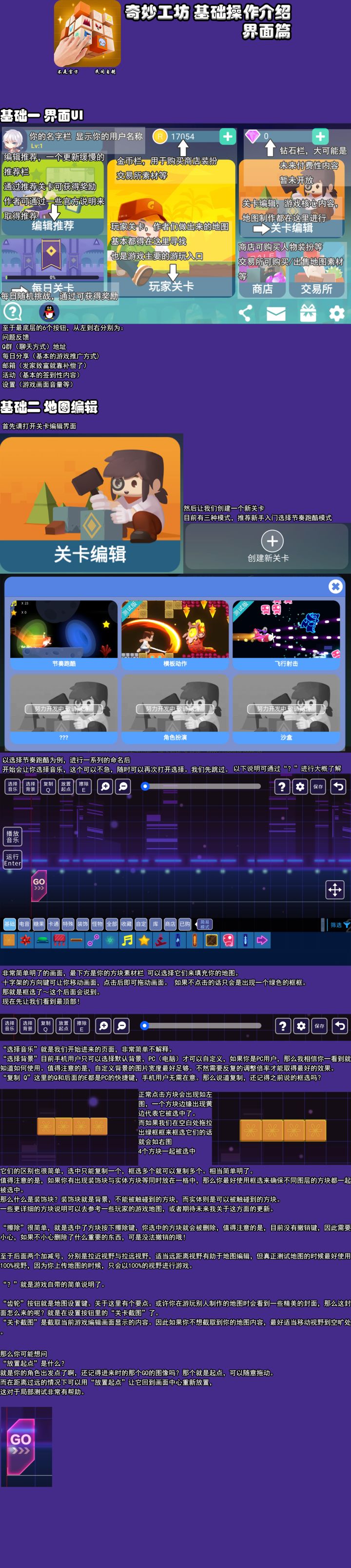 不管惊险刺激的关卡,还是百变不一的风格,亦或是经典的抖音神曲配乐,所有的这些你想要的,都可以在【关卡编辑器】中实现。今天小编就先来给各位创造者们,介绍一下编辑的功能。(强行鼓掌十分钟)《奇妙工坊》目前支持手机版和PC版。由于关卡编辑器的复杂性,推荐想要更便捷的编辑关卡的小哥哥小姐姐们,使用PC版编辑器功能昂。以下介绍将基于PC版编辑器的使用。创建一个关卡后,就进入的关卡编辑器中,如下图 整体