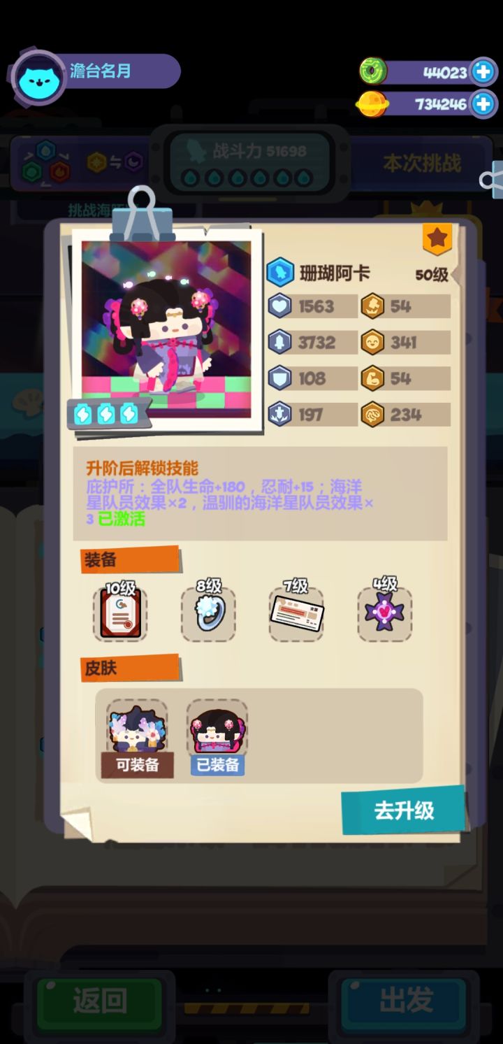 砂鱼满星小众阵容~薯条国王 50级2皮 装备10 10 8 8紫弦月 46级1皮 装备8 9 6蛛女 60级1皮 装备8 8 9 8人鱼轻音 50级2皮 装备10 10 9 8海蛇莱斯莉 50级1皮 装备8 8 8(我用2皮减探索时间的莽过去的哈哈哈 用1皮会更好一点)火焰巨人 5级思路是利用海蛇莱斯莉风元素额外攻击的概率让自己、薯条或人鱼多打一次伤害,从而尽快结束战斗~【薯条只能撑过3回合,打不完就没法满星了】我是第三次莽过去的,2回合解决战斗,概率应该都差不多~