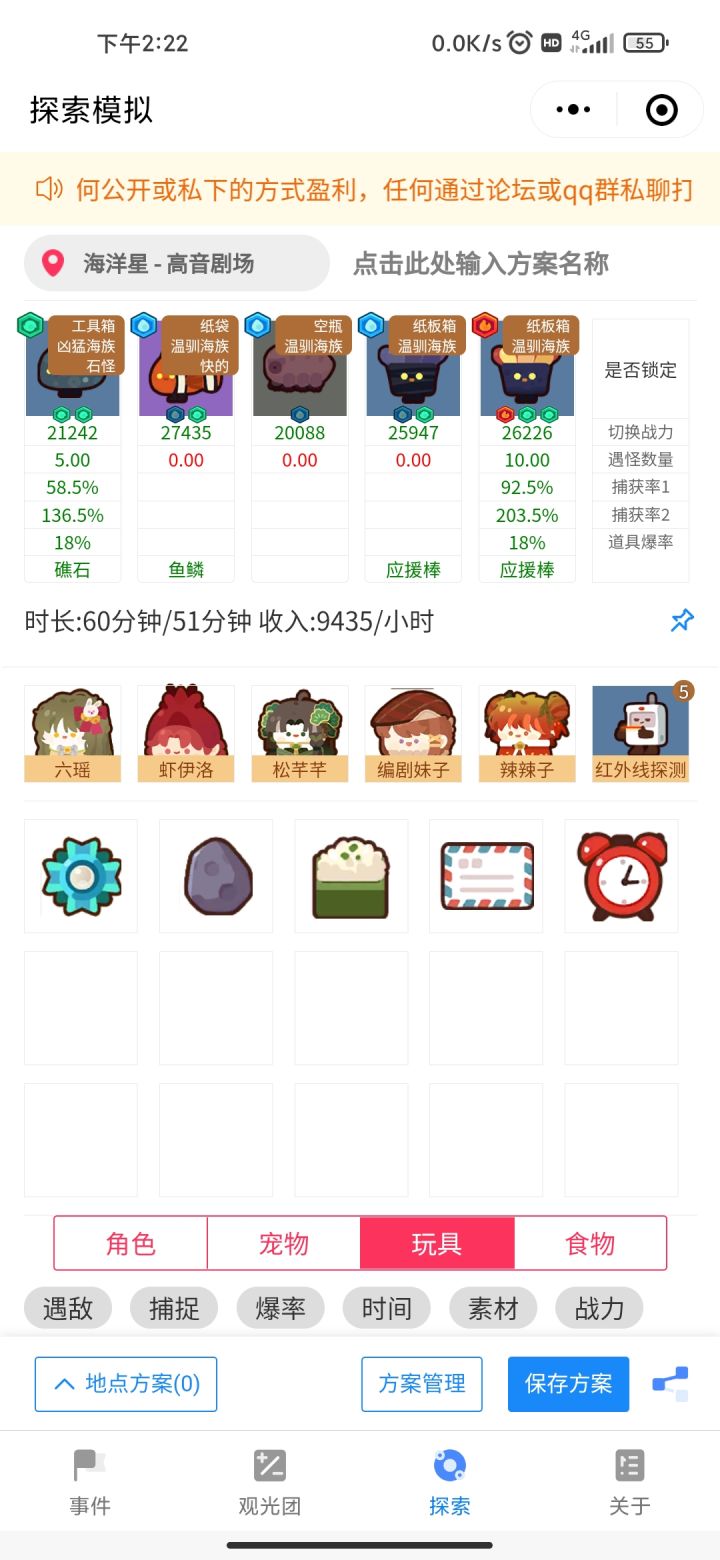 首先尝试过用一级陷阱抓祭祀石,但是紫色史莱姆实在太烦人,最终还是决定不省这点鸡腿,用二级陷阱。阵容方面基础思路还是凑100%屏蔽,考虑中期玩家玩具不够用,那就干脆用阵容达到需要的效果,我的场上已经100屏了,如果没有四荔那也可以用两个格子凑25%。注意金怪不开,小刺毛要用玩具屏蔽,一个动物牌解决。(5577在性价比更高的刷钱队,不急着刷钱、电池的可以用57)需要带的玩具如下图,没有交通牌也没有
