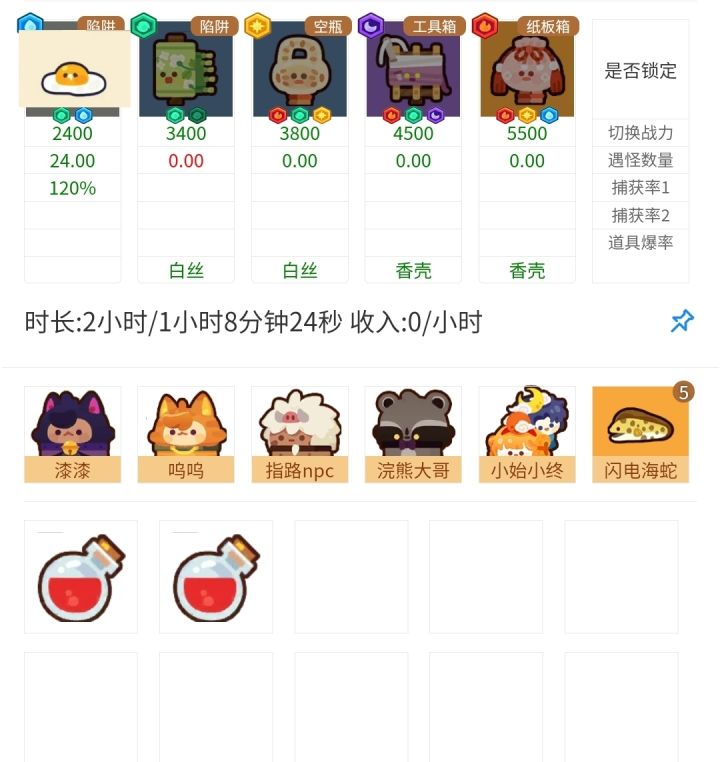 当进入三球四球的中后期阶段时,四队已开,会有2-3支队伍不需要参与剧情任务,可以用来刷所需的素材。在此提供以下两种队伍配置方案:1.寿司镇:5577,骨头兵,村长夫人,侦探小姐(或精灵王子)。队伍配置中仅侦探小姐(或精灵王子)的升阶较难,其余都十分容易。宠物携带黑脸鱼子寿司可以增加鱼肉掉落,合成兑换黄电池。节约食材的肝帝可设置短时间:一小时一分30秒躺平养老的咸鱼可设置长时间:9小时30分由