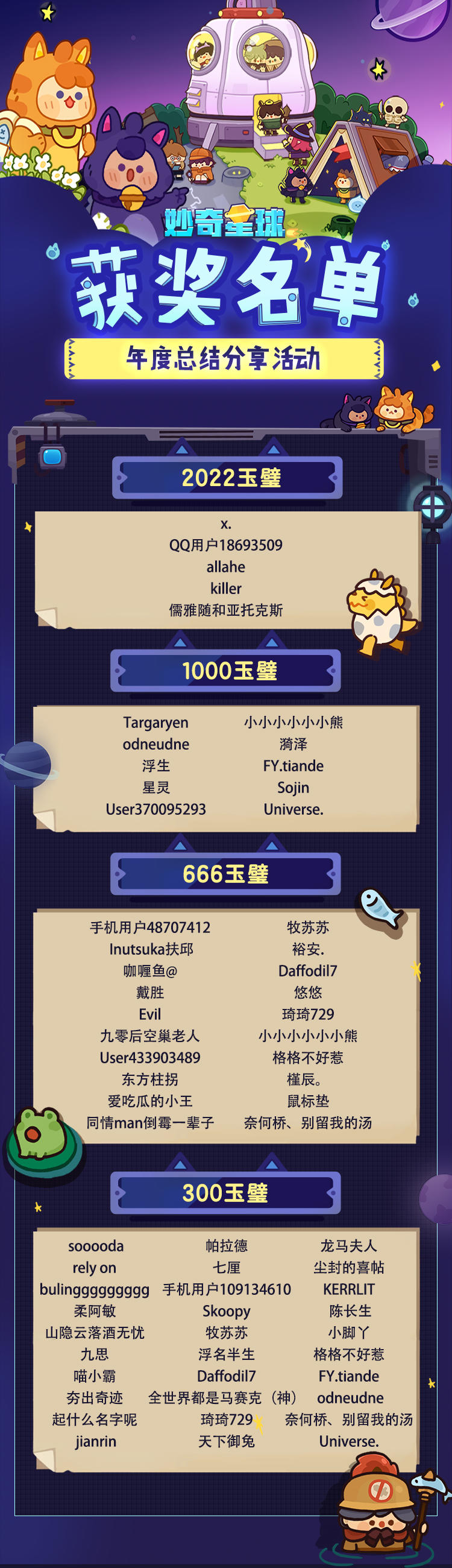 开奖啦~~~请获奖的冒险家在7天内添加Q群700439216联系管理员领取奖励,逾期视为放弃~=======原贴如下======今天是呜呜漆漆一周岁的生日,也是冒险家们踏入星球的一周年纪念日。本次年度总结统计了各位冒险家在这一年中的多项信息,承载了呜呜漆漆和冒险家们一起留下的无数美好回忆。各位冒险家可在游戏公告内开启专属于你的年度总结,悄悄告诉各位冒险家,每个人的最后分享页面可能有所区别