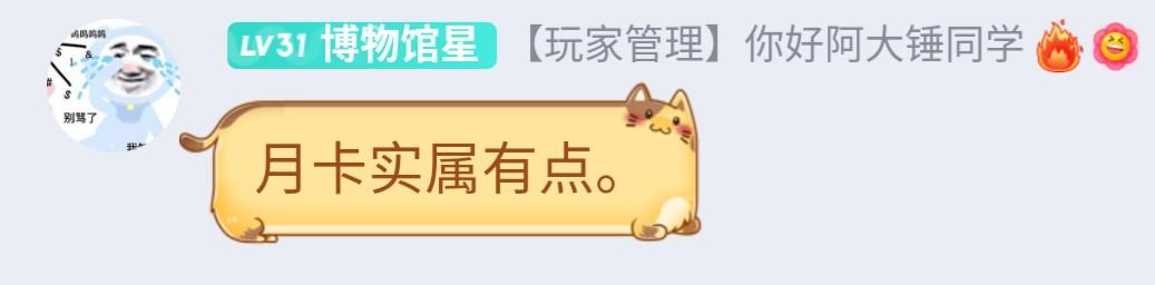 月卡!月卡!***月卡!快点多给点吧,多给点吧,多给点吧,月卡,月卡,起码每个月给我凑个20抽吧,不过分吧,不过分吧不过分吧,就咱游戏这出货率,30块等30天抽20抽不过分吧,不过分吧不过分吧不过分吧,快点加强月卡吧加强月卡,我打卡机都四级了,再不加强谁知道月卡结束的时候我都不知道我还玩不玩。🙈🙉🙊看啊,管理都说不合理,天地良心,明码标价,钝刀杀人啊!@套路工作室@套套工作室@套鹿工作室@鹿鹿工作室@路路工作室@路套工作室@鹿套工作室@工作室套鹿