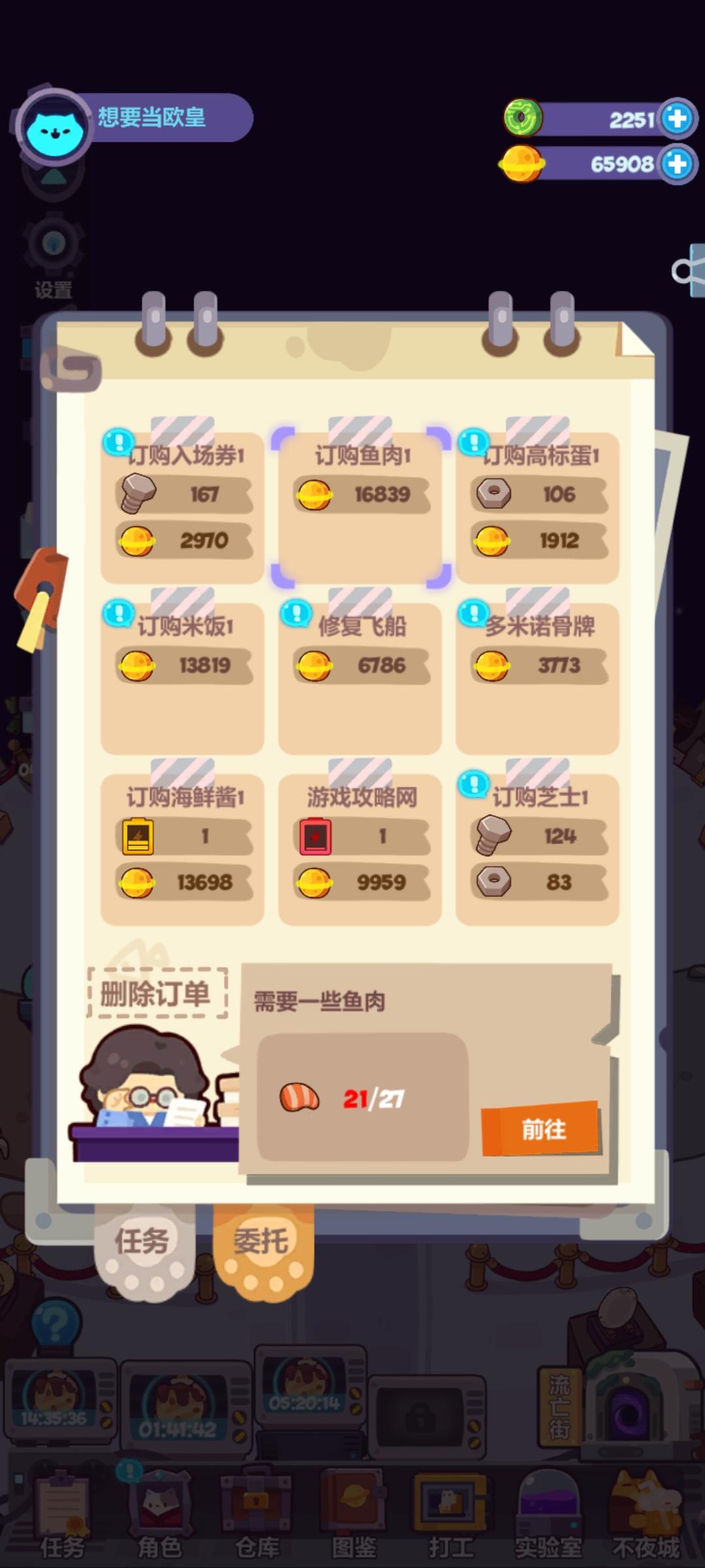 建议出个一键删除所有订单的按钮,看一圈订单需要什么材料很快,可要删除订单还要一个一个点,很麻烦的,直接出个一键删除,看一圈订单,合适的就交,不合适的看完一圈一键删掉等刷新岂不美哉