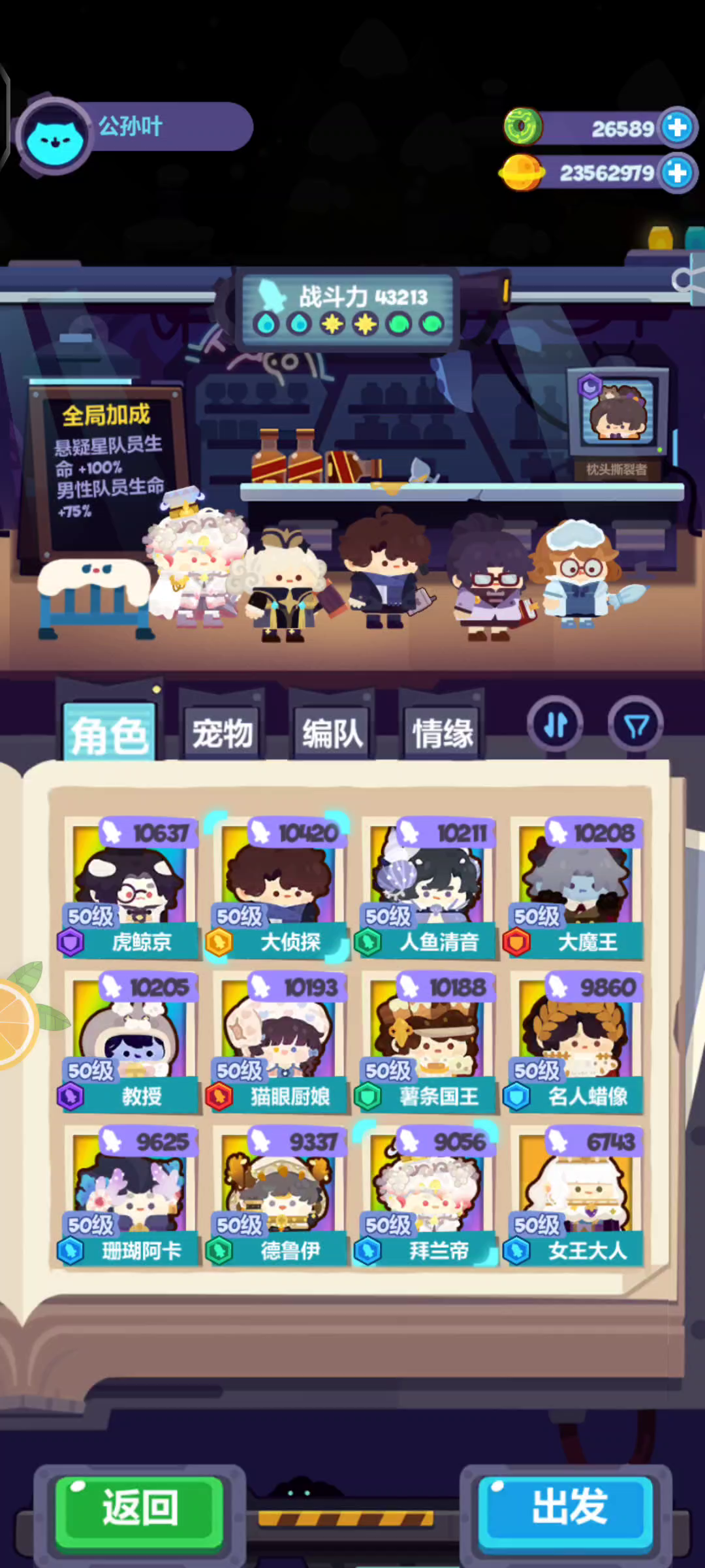 猫娘 50级 三阶 一皮(默认) 8 8 8 8 全家具(暴击+25) 德鲁伊 50级 三阶 一皮(默认) 10 10 8 8 女王 50级 三阶 三皮(情缘减等级) 8 8 8 蜡像 50级 三阶 二皮(情缘减等级) 10 10 8 8 全家具(全队忍耐+5) 大魔王 50级 三阶 一皮(减等级) 10 10 10 9 全家具(敌人等级-5)
