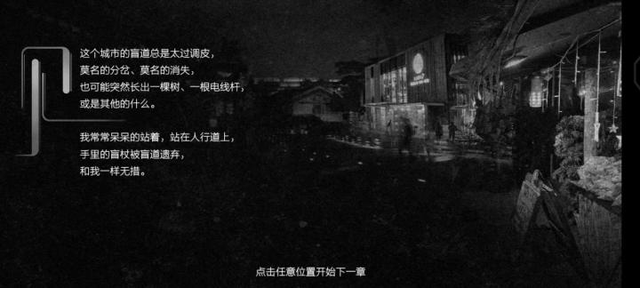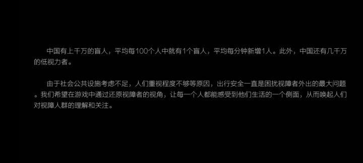 大概用了59分钟通关游戏,怎么说呢,感触很深。 一片空茫黑暗,让我感到寂静又恐慌。摸不到东西的急躁,盲道上挡路的东西,忙乱的街景,鸣笛的汽车,陌生人的声音还有面对空荡荡一切的怯声询问……这些都很陌生,那些细细寻觅的路牌还有听触感受的景色,美丽的海浪声,动人的姑娘,对自己现状的迷茫,很真实。真的联系现实,可能还会有人们的议论,污脏的设施等都会令人烦恼难过。还有路上的那些善意,会令人感到暖心和快意。每个人的人生都有意义,找好方向,认真踏实,真的很重要,最重要的是一定要有一颗热爱生活积极向上的心。 同时也希望国家能重视这些相关的设施建设,我不太了解这些,经过这个游戏真正认识到了不要占用盲道等等,完善这些不足真的还有很长的路要走🙏
