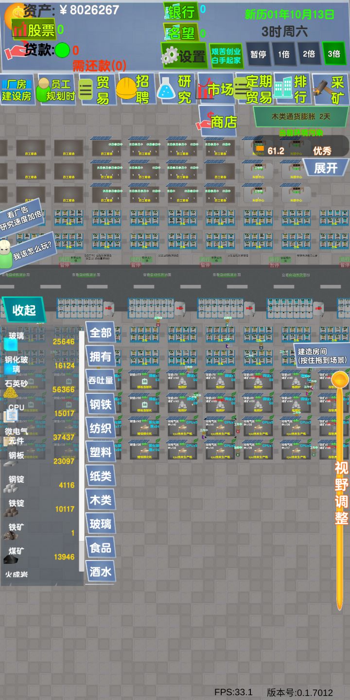 首先一定要有大局观,你的厂房怎么规划更好发展(建议分区 如宿舍区 研究区 厂房区 仓库区)仓库一定挨着路边,后期货量大有资金安装自动分拣。新手建议做钢铁,价格幅度大,容易发展。首先前期做2个仓库和一个铁锭机房一个宿舍 招募几个搬运工就可以了。看好行情出单,一般铁锭价格在5左右。但是我的主流不是生产,而是生产+投机,等到某一类物品通货膨胀价格大跌的时候,贷70000左右,那一半多做几个机房和仓库。然