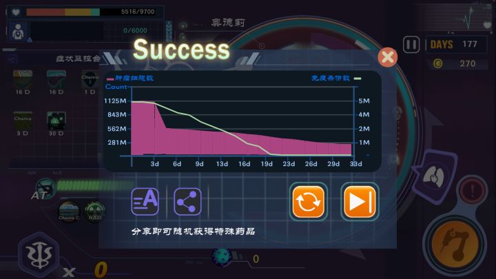 这关卡了老半天了,最后终于研究出来一套超快速简单的通关方法。工具选第一个化疗注射器,机器人也第一个。1.开局两个并发症不用管,直接去化疗,A小剂量、B小剂量、抑制剂,金币剩余3200;2.换到放疗,连开两次大放疗,金币剩余200;3.返回主界面,第一周,等化疗生效后癌细胞直接降至580M左右;且金币增加至1000,并发症全都不管;4.买一瓶心肌营养液,金币剩余300;5.返回主界面,第