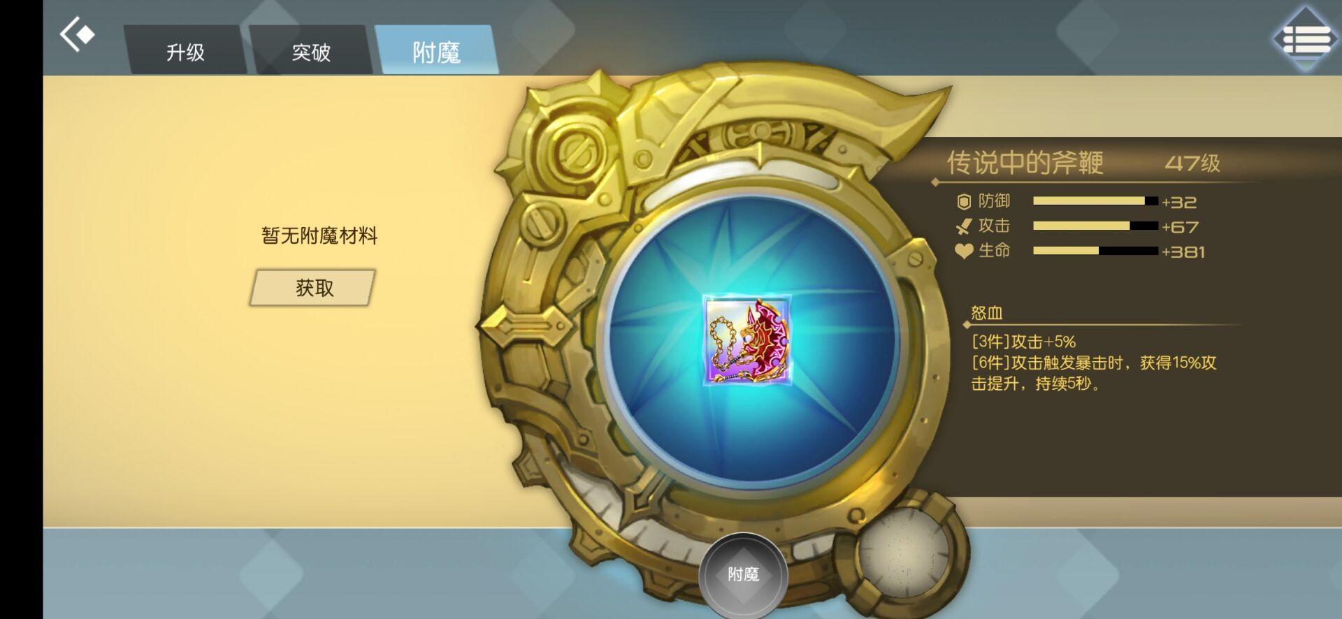 中级附魔的上限是没有高级附魔高的,如图,可以看出中级附魔的攻击到八十多左右就满了而高级附魔在攻击达到80的情况下还有一段条没满,所以,推荐给主力优先高级附魔,中级附魔给支援就行了。(不用和我说装备问题,同样的祝福帽子也一样)装备图来源:@星魂—————————————————————————————战力图萌新交流群:650039826