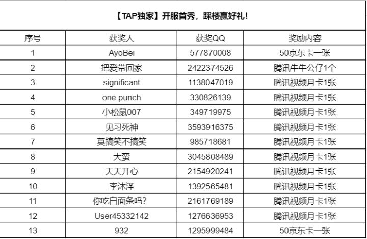 【TAP独家】开服首秀,踩楼赢好礼!活动获奖公告