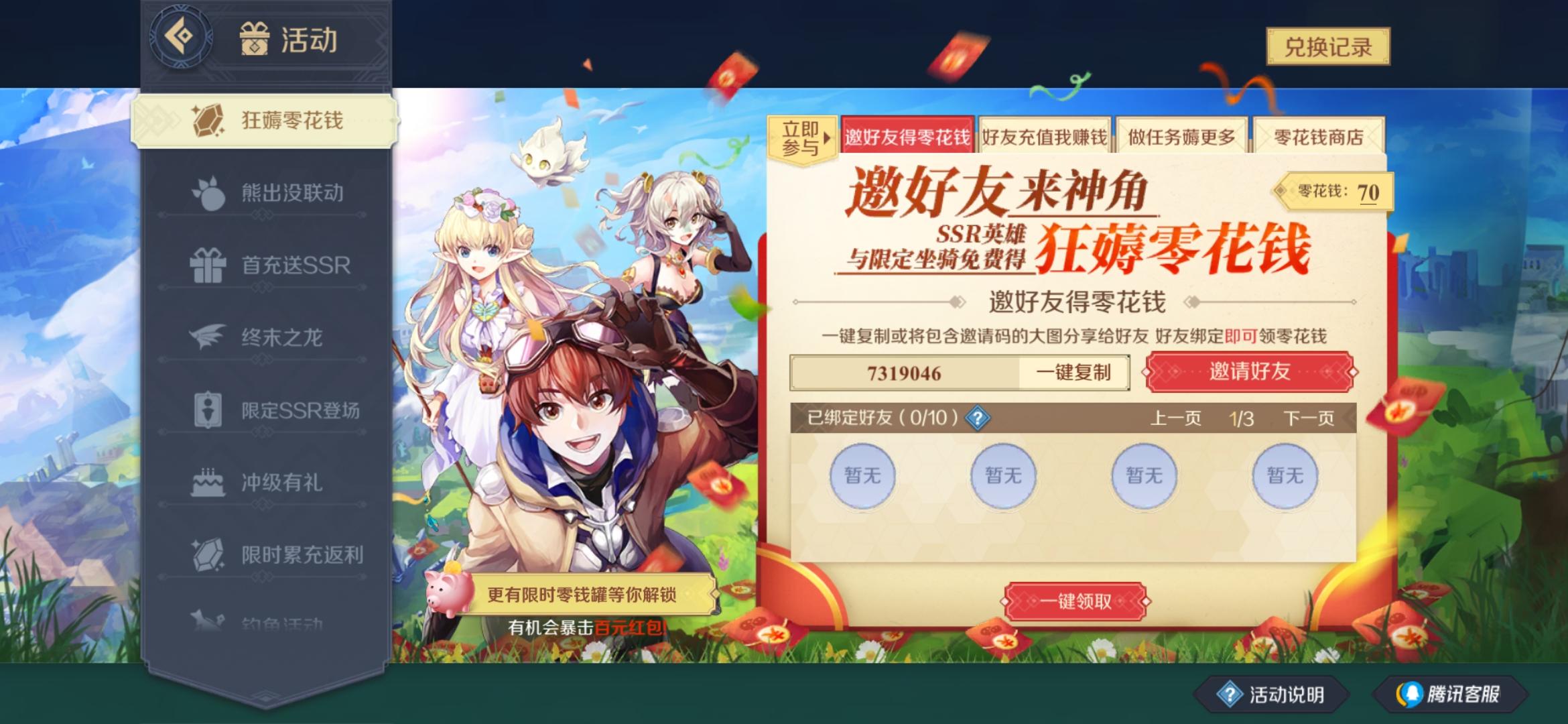 新手进去右上角绑定好友填1172024可得奖励,大家一起玩