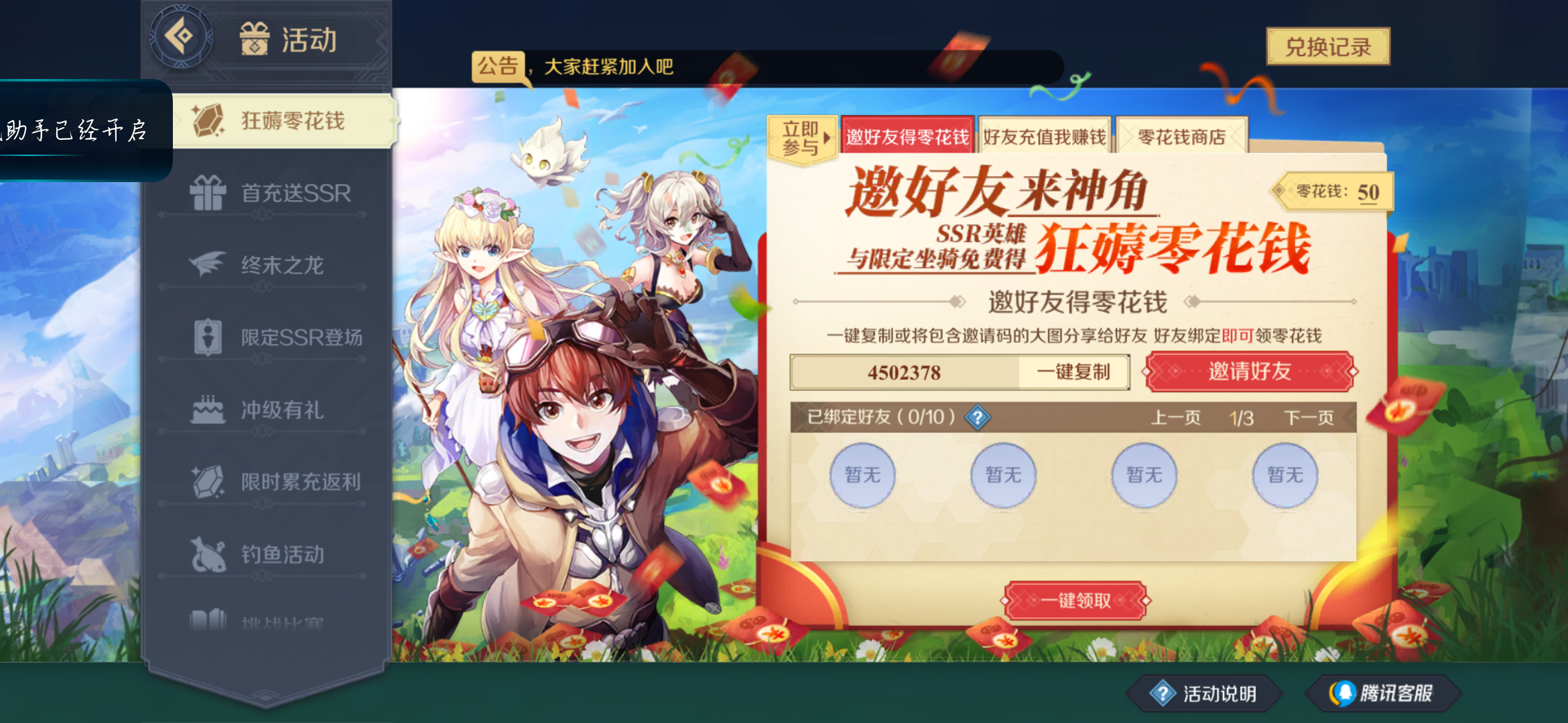 新手进去右上角绑定好友填1172024可得稀有坐骑,50零花钱