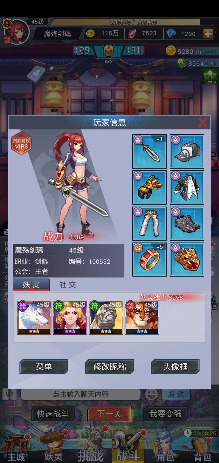 今天给大家写个新手入门攻略进入游戏随着一段引导对话,新手教程,我们开始一游戏,打到两关开始自动打击第三关结束开始了我们的重头戏妖灵,他会让我们抽到虎妖这个妖灵还是很不错的,是凡品妖灵里比较强的,护佑加攻击了,(每个妖灵都有护佑护佑会增加主角属性)这里给大家推荐下妖灵搭配符:金刚,夜魔,鬼判,狼王,银角,血伯爵, 金刚有着超高的抗压能力,加上夜魔吸血,很强器:夜魔,天狼,鬼判,狼王,银角
