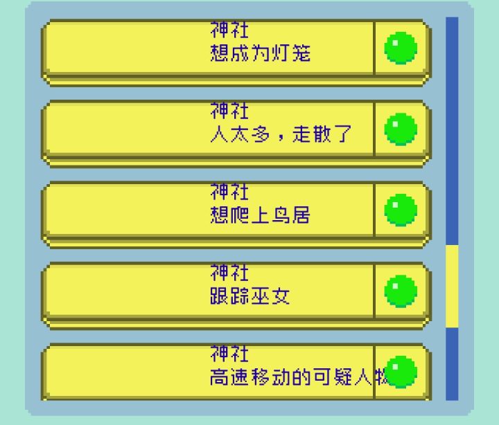 神社场景有五种事件↓想成为灯笼的选项和不同选项的加成点数:人太多走散了的选项和不同选项的加成点数:想爬上鸟居的选项和不同选项的加成点数:跟踪巫女的选项和不同选项的加成点数:高速移动的可疑人物的选项和不同选项的加成点数: