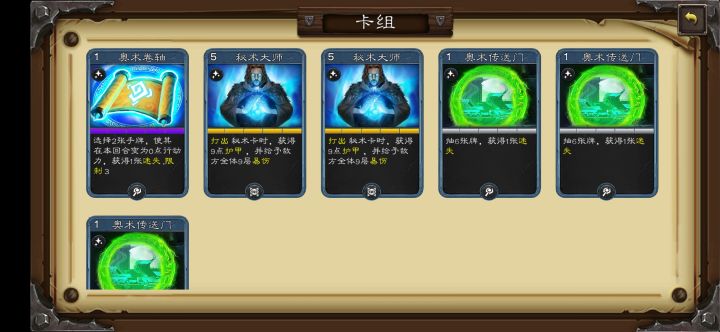有意思的套路,无脑刷金币,简单易操作。 【所需卡牌】 秘术镜像2张、奥术爆发1张、先知药水1张、炼金大师1张、超视觉1张、奥术传送门1张 【方法步骤】 1、先将boss打出无敌状态,利用奥术传送门将上面所需的6张牌都抽到手上,清空抽牌组上的牌。 2、秘术镜像无限自我复制,手上至少留2张。 3、复制奥术爆发,至少留1张 4、复制炼金,让所有炼金都进弃牌组; 5、复制先知药水,留1张在手上,其他的进弃牌组。 6、复制超视觉,用超视觉将弃牌组的2张炼金放在抽牌组,留1张超视觉在手上。 7、至此,手上会有2张秘术镜像、1张奥术爆发、1张先知药水、1张超视觉。 8、利用镜像爆发无限用先知药水,会让抽牌组的两张炼金生效,可叠金币,顺带刷,后面金币叠起来后再用超视觉将弃牌组里的先知药水放到抽牌组,应该刷得更快。