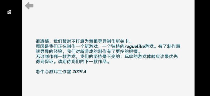 1↓不知道为啥就这样了,重启后好了。2↓点进去发现点错关卡,返回主页后关卡详细页位移到其他地方。3↓简介中出现不止一处的文字错误,建议进行更严格的文本校对。996年、四出为硬性错误,文中几处及的用法较为拗口,更像是机翻。4↓划动关卡后在没有背景的地方关卡依旧存在。建议要么全铺背景,要么划出背景关卡消失。