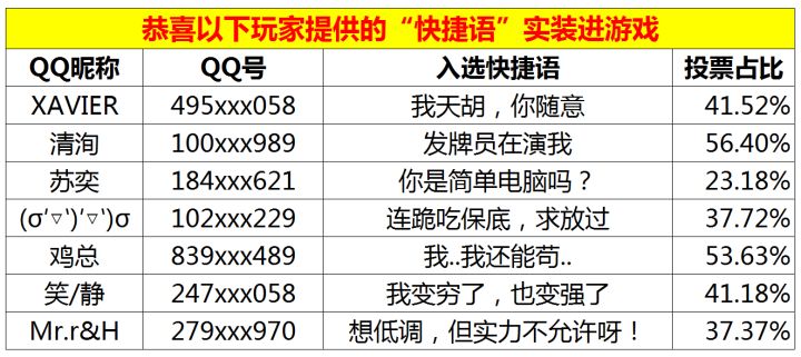亲爱的小伙伴们:距离7月25日首发上线倒计时三天啦~~在等待上线的同时,是否还记得上次QQ群的“聊天快捷语征集投票”活动呢???在小伙伴们的热情参与之下,该活动已经圆满结束啦٩(๑❛ᴗ❛๑)۶经过第一轮的初步筛选和第二轮的投票环节,恭喜这些小阔爱提供的“聊天快捷语”人气最高,并成功实装进游戏版本(名单如图)~~为了感谢小阔爱们的热情提供,他们将每人获得一份感恩回馈礼包(钻石*177,30